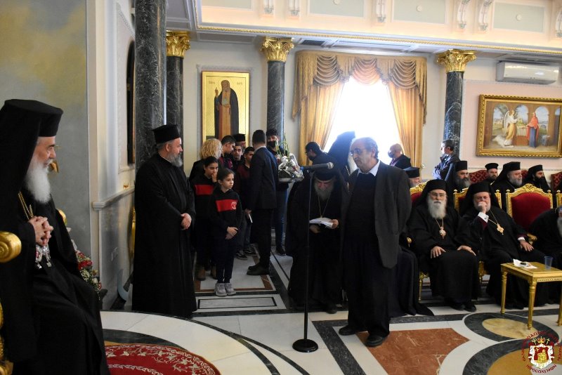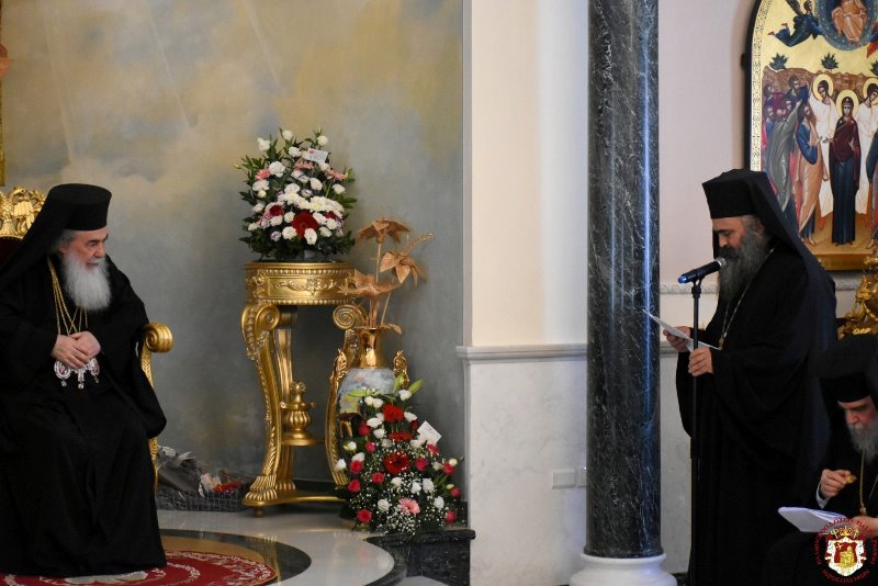 For all these, we call upon all who prayed along with Us and honoured with their presence this enthronement anniversary of Ours, wishing them strength from on high, the enlightening power of the Holy Sepulchre, patience and every blessing from God, expressing also Our warm thanks to all who addressed Us; Geronda Secretary-General, His Eminence Archbishop Aristarchos of Constantina, who spoke on behalf of the Holy Synod and our Hagiotaphite Brotherhood, His Excellency the Consul General of Greece Mr Evangelos Vlioras, Reverend Archimandrite Alexander the representative of the Brotherly Holy Church of Russia, who conveyed the wishes of His Beatitude the Patriarch of Moscow Cyril, His Eminence Metropolitan Kyriakos of Nazareth who spoke on behalf of our flock in Nazareth, His Eminence the Archbishop Damascene of Yaffo who spoke on behalf of our flock in Yaffo, Reverend Father Charalambos Bandour who spoke on behalf of Saint James Cathedral, Reverend Archimandrite Philotheos who spoke on behalf of the Community of Acre-Ptolemais, the Principal of Saint Demetrios School of the Patriarchate Mr Samir Zananir and the teachers Mrs Kafetzi and Mr Kongos, Mr Moris Sabela who spoke on behalf of the polyclinic ‘Saint Benedictos’, His Eminence Archbishop Aristovoulos of Madaba who spoke on behalf of the Russian-speaking community in Ashdod, Mr Athanasios Abu Eta and Ode Issa, the Hagiographer Gabriel and all who participated in the celebration of this enthronement anniversary.”