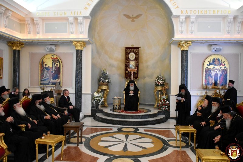 At the Great Hall, Geronda Secretary-General, His Eminence Archbishop Aristarchos of Constantina addressed His Beatitude on behalf of the Holy and Sacred Synod and the Hagiotaphite Brotherhood as follows:
